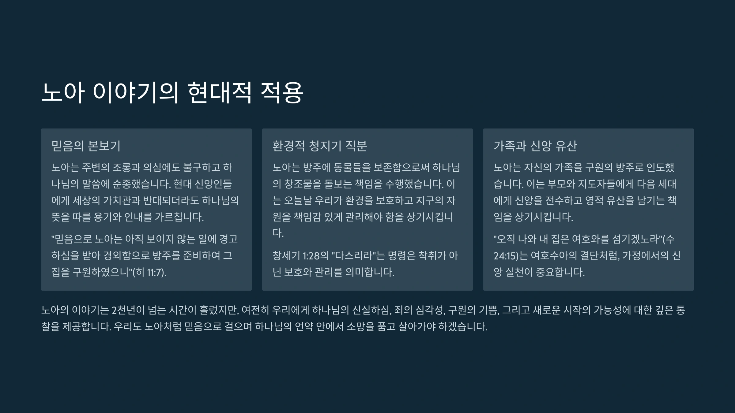 💡 다음 섹션에서는 오늘 우리 삶에 이 이야기를 어떻게 적용할 수 있을지, ‘노아처럼 사는 것’의 실제적인 의미와 도전, 그리고 2025년의 현실에 딱 맞는 현대적 메시지를 나눠볼게요. “계속”만 눌러주세요!
