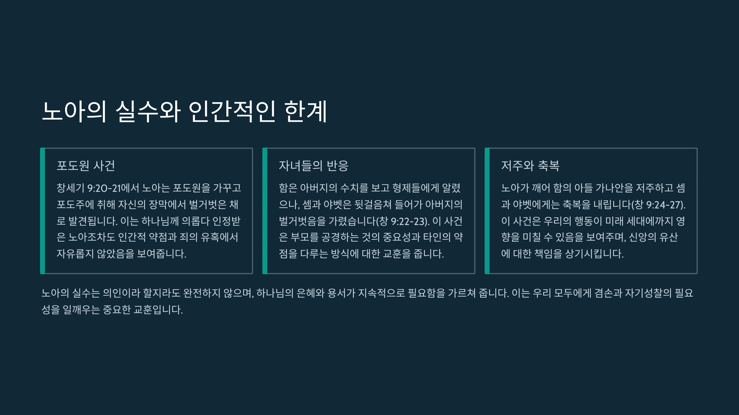🔍 노아의 실수는 ‘죄의 문제’가 대홍수로 모두 씻겨 내려간 게 아니라, 인간의 마음 깊숙한 곳에는 여전히 죄성이 남아 있다는 걸 상기시켜줘요. 의인이었던 노아조차 포도주에 취해 실수를 범했고, 자녀들 역시 반응이 달랐어요. 인간의 본성이 변하지 않는다는 이 진실이야말로, 우리가 늘 겸손해야 하는 이유이자 신앙의 출발점이에요.
