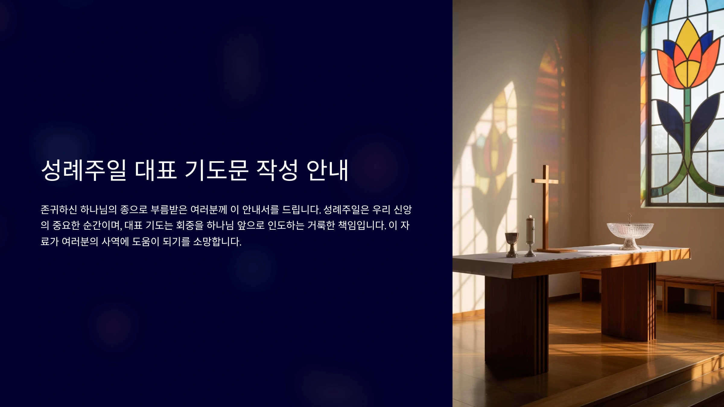 💡 대표 기도는 단순히 정해진 문장을 읽는 것이 아니라, 기도자가 성도들의 마음을 모아 하나님께 올려드리는 영적 행위입니다. 특히 성례주일에는 예수 그리스도의 희생과 구원, 그리고 새롭게 태어난 생명에 대한 감사와 간구를 담아 기도해야 합니다.